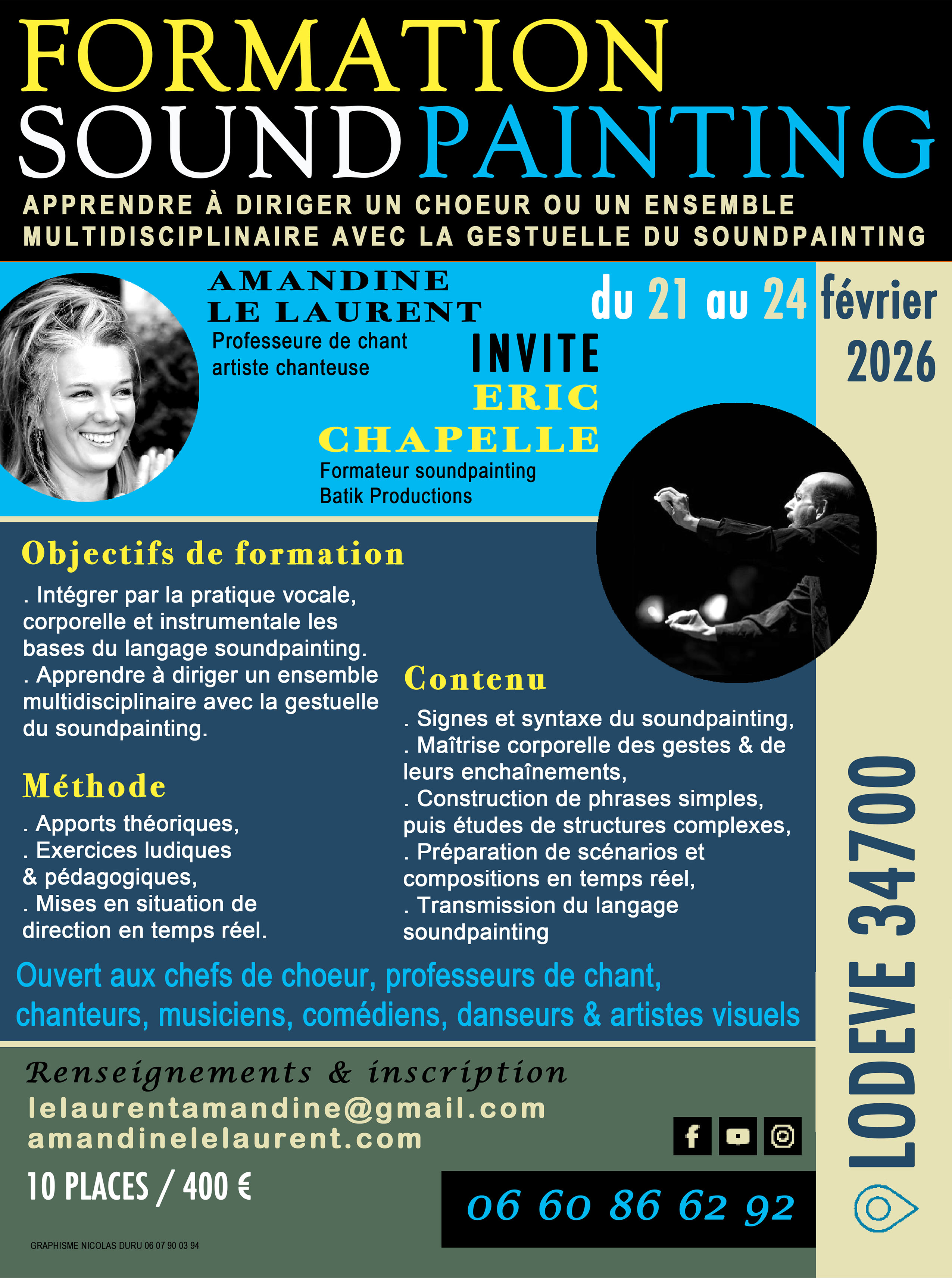 Au delà de l'apprentissage de techniques de composition en utilisant pour médium le langage du soundpainting, ce stage invite à une réflexion et à une prise de conscience sur le travail d'écriture multidisciplinaire.
